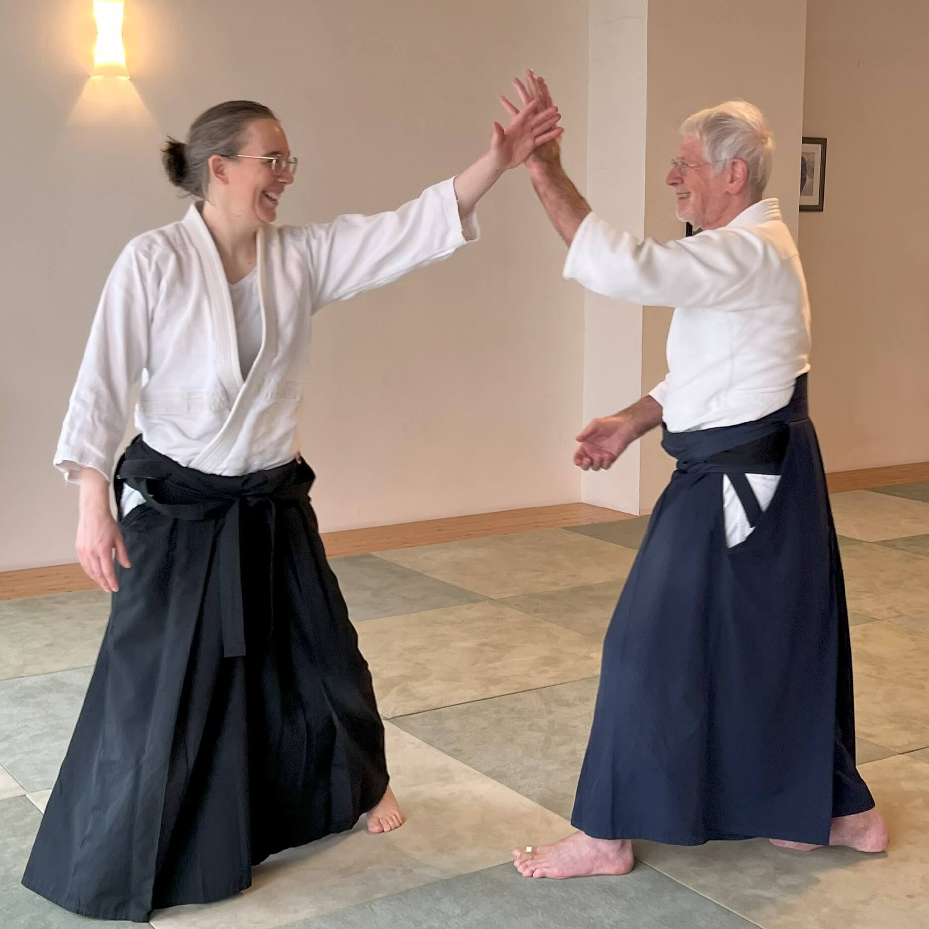 Wir üben fast immer zu zweit. Einer von uns übernimmt die Rolle des Angreifers, jap. Uke, und der Andere die Rolle des Aikido-Technik-Ausübenden, jap. Tori. Normalerweise üben wir eine vorgegebene Bewegung vier mal und dann wechseln die Rollen. Du lernst also nicht nur die Aikido-Techniken, sondern auch für welche Angriffe sie sich am besten eignen. Du lernst auch, wie sich das anfühlt, wenn dein Angriff nicht funktioniert und du mit einer Aikido-Technik daran gehindert wirst, ein zweites Mal anzugreifen. Je fortgeschrittener du wirst, desto schneller und realistischer kannst du angreifen bzw. die Technik ausüben. Du musst aber sicherstellen, dass niemand dabei zu Schaden kommt. Darum sind gegenseitige Empathie und Respekt im Training sehr wichtig. Wenn eine Aikido-Technik perfekt gelingt, fängt der Uke oft an zu lachen, wenn er am Boden liegt. Weil die Art und Weise, wie du ihn oder sie unter Kontrolle bekommen hast, verblüffend und überraschend war. Alter, Körpergewicht und Geschlecht spielen nur eine untergeordnete Rolle, ob du eine Technik gut und wirkungsvoll ausführen kannst. Manchmal kann es sogar von Vorteil sein, wenn du z.B. kürzer bist als der Angreifer – lass dich überraschen, was alles möglich ist!