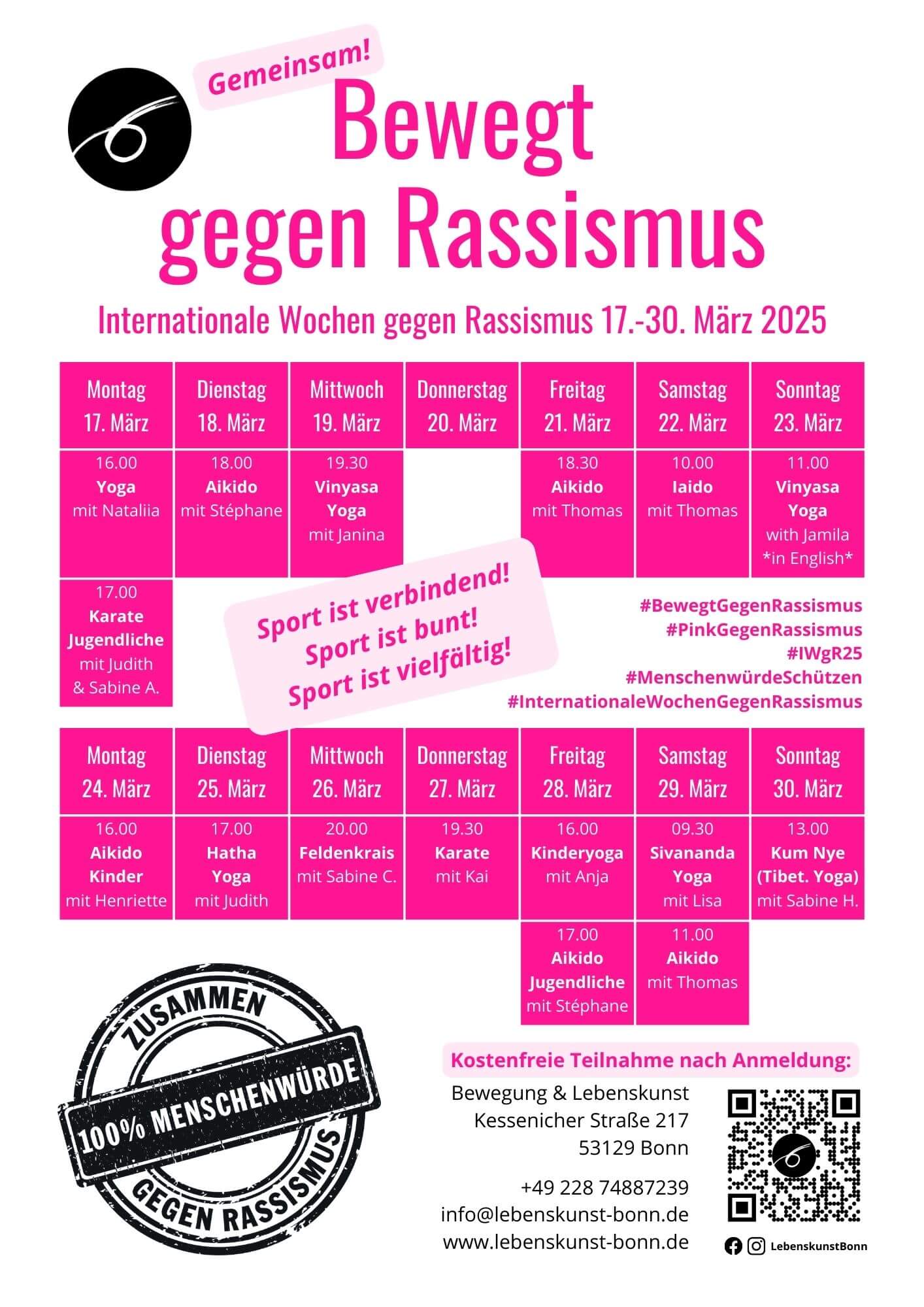 Der 21. März ist der Internationale Tag gegen Rassismus. Um dieses Datum herum finden weltweit Aktionswochen der Solidarität mit den Gegnern und Opfern von Rassismus statt. In 2025 stehen die Internationalen Wochen gegen Rassismus (IWgR) unter dem Motto „Menschenwürde schützen“ und finden vom 17.-30.03.2025 statt. Mehr Infos: https://stiftung-gegen-rassismus.de/bewegtgegenrassismus