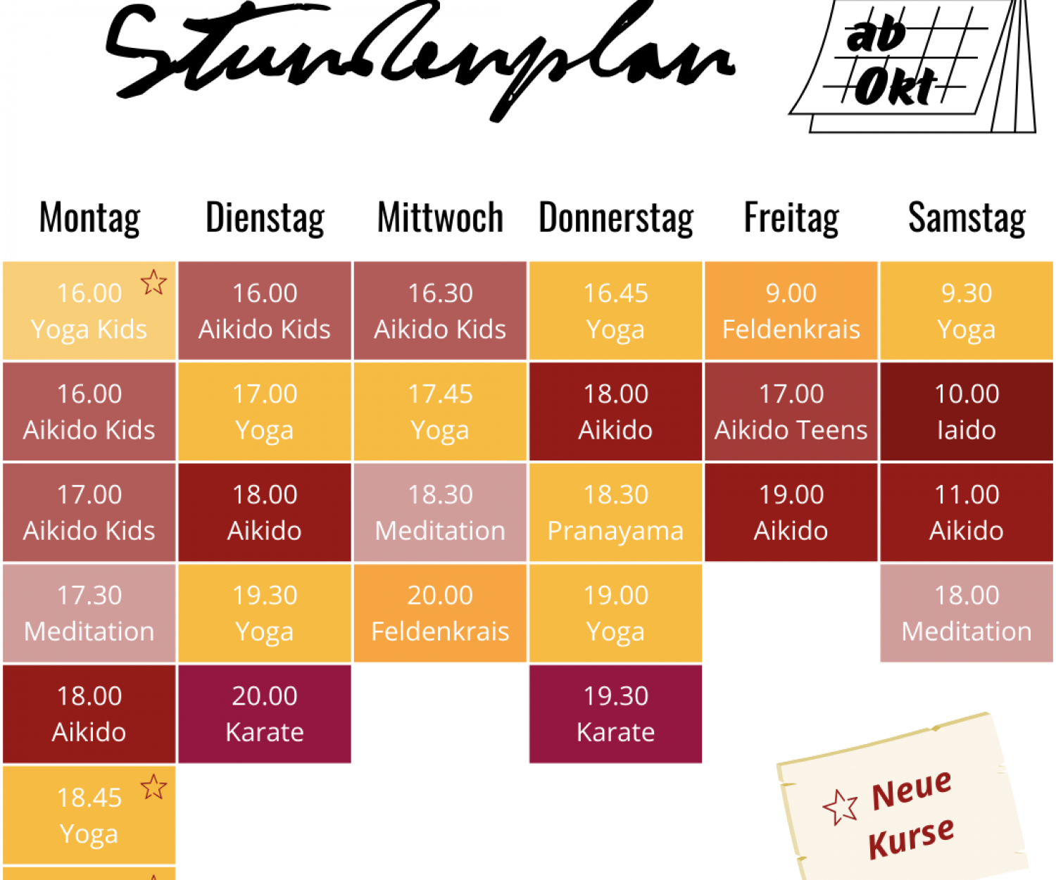 Kurse 01 Okt. 2023 Aktueller Stundenplan Neue Kurse im Oktober: 👉 Yoga für Kinder (6-10 Jahre) mit Judith: Montag 16.00-17.00 Uhr (startet nach den Herbstferien) 👉… Judith Raß
